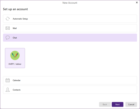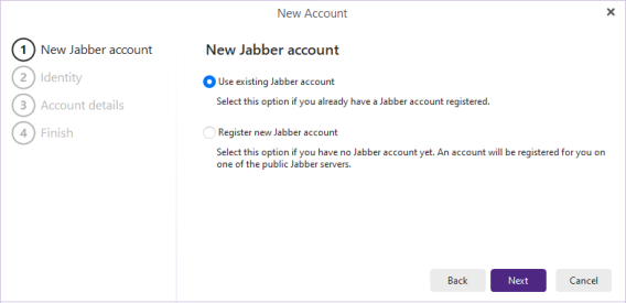 Select Use existing Jabber account if you already have a Jabber account. Enter your account information and your IM account will be created. If you do not have a Jabber account, click Next to proceed.