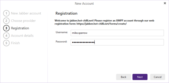 Tip:This application will suggest a list of free Jabber Hosts, you can type in any Jabber hosts you prefer. Note, different Jabber hosts offer different transports to different networks.