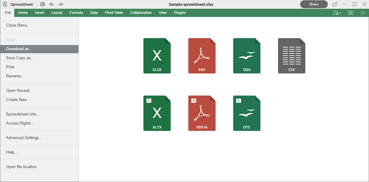 • In the online version, save the current file (in case the Autosave option is disabled), download as (save the spreadsheet in the selected format to hard disk drive of the computer), save copy as (save a copy of the spreadsheet in the selected format to the portal documents), print or rename it, in the desktop version, save the current file keeping the current format and location using the Save option or save the current file with a different name, location or format using the Save as option, print the file