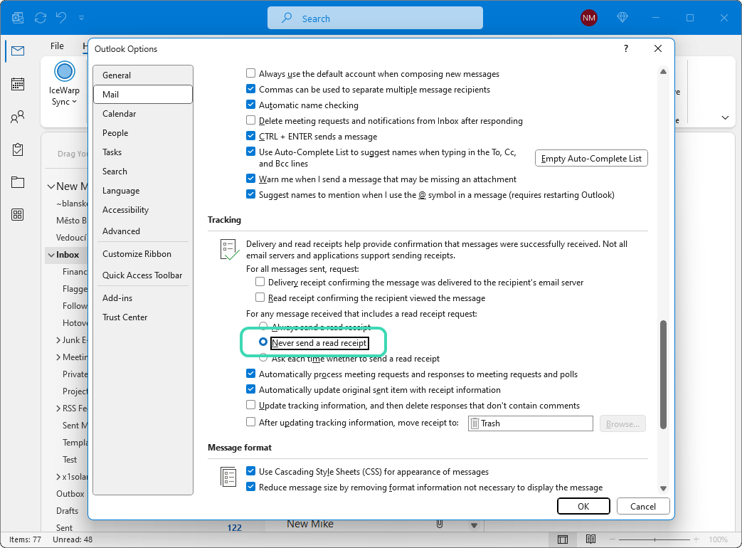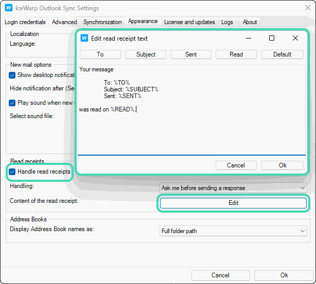 Go to Outlook Sync’s settings -> Appearance tab and check Handle read receipts checkbox. From now on, Outlook Sync will handle all incoming read receipt requests.