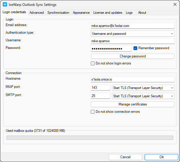 Note: If you are not able to receive emails, verify that the incoming ports you use (143 or secured 993) are not blocked by your firewall. Outlook Sync uses IMAP protocol with IceWarp extension. Proxy or antiviruses might not recognize the protocol and block it.
