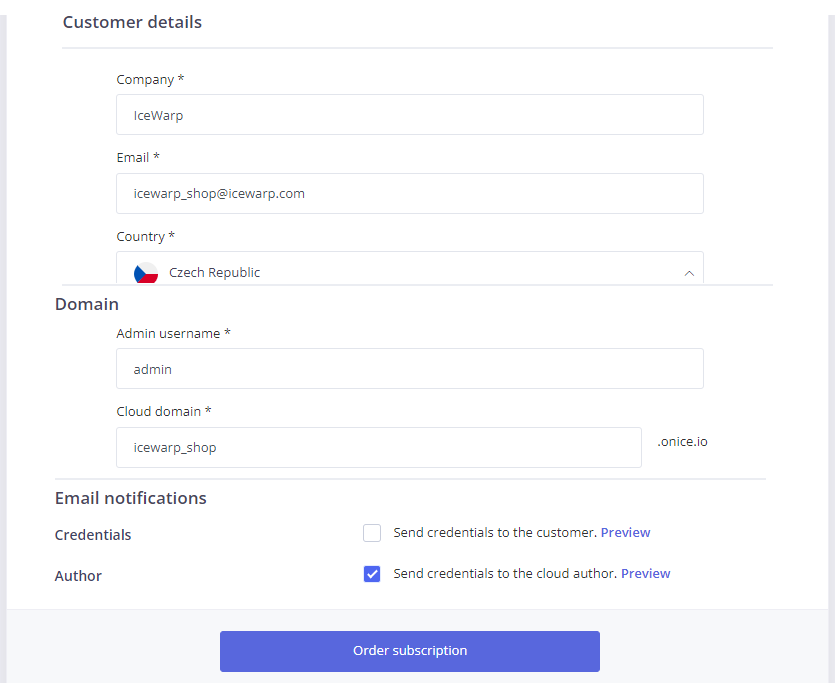 You can decide whether to send the login and password to the customer (contact person you indicated in the customer details). However, we recommend to always check the Send credentials to the cloud author checkbox. The account manager who created the order should have email with login and password to provide better services to the customer.