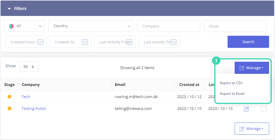 To export the list of leads in CSV or Excel format, click Manage and select the option from the list