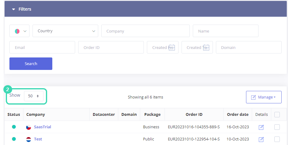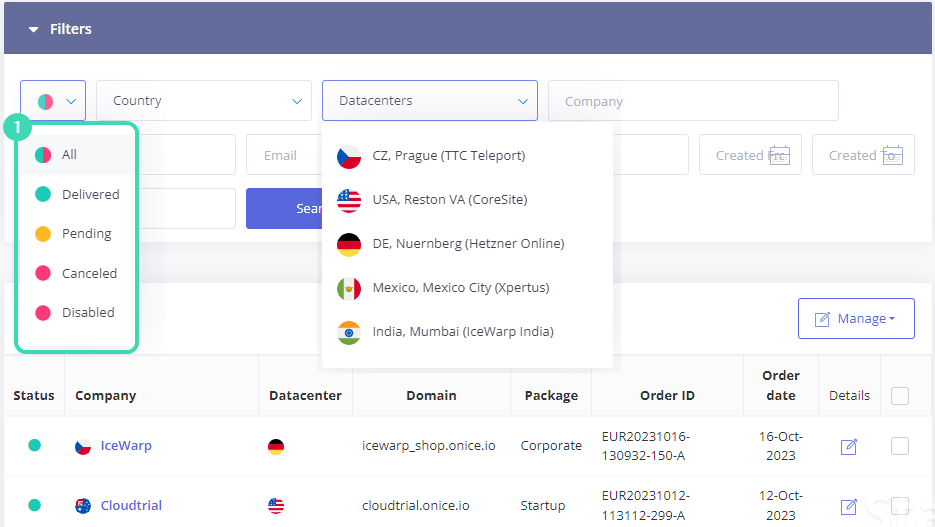 Filter of the SaaS order list is the same as for Cloud. However, as the user's data is stored on the customer’s server and not on the IceWarp server, there is no data centers list.