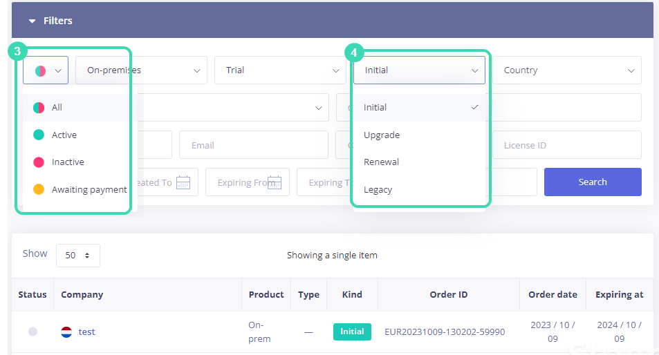 The legacy orders can be filtered by the license status