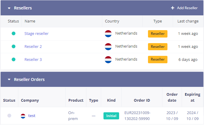 In the Resellers and Reseller Orders sections, you can add information about your resellers (name, price lists, and billing details), as well as to see the list of their orders.