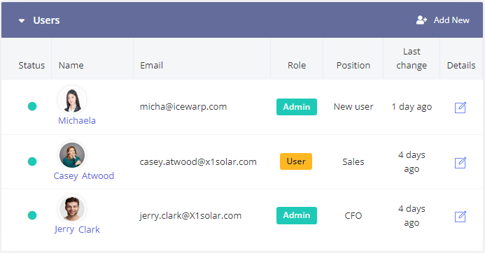 In the Users section, you will find the list of users and their roles. Accounts with admin role can create all kinds of orders and leads. Accounts with user role has limited rights defined by admin. To edit the user information, click