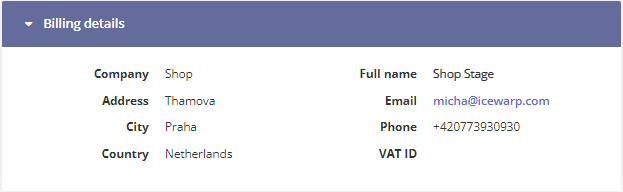 In the Billing details section, you can check the accuracy of your billing data that is used by IceWarp to create invoices for you.