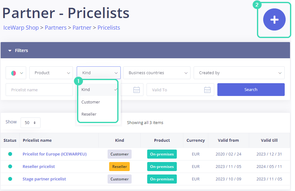 In the Pricelists tab, you will find the price lists for Customers (end-users) and Resellers (the partners that have their own end-users)